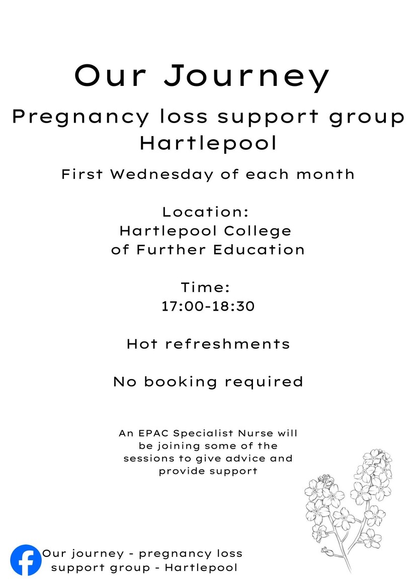 Our Journey - Pregnancy loss support group The first Wednesday of each month at Hartlepool College of Further Education, from 5pm to 6:30pm. Hot refreshments provided and no booking required. An EPAC Specialist Nurse will be joining some of the sessions to provide advise and support